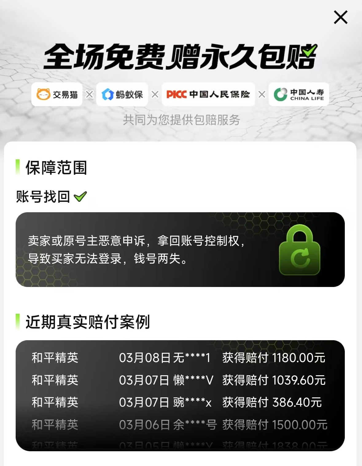 交易过程中的安全保障,对于买卖双方来说都是很有必要的。购买者害怕遇到虚假宣传问题,担心账号到手之后再出现被找回盗号这样的情况。出售者也担心账号出售出去之后拿不到自己应有的收益,这些问题在交易猫中都能得到解决。交易猫安全有保障,自身属于阿里巴巴灵犀互娱旗下品牌,拥有大厂背书,同时也是业内唯一一个全场覆盖永久包赔的交易平台。永久包赔指的是出现找回、盗号等情况,按约定比例进行赔偿。这一点在一些大额交易过程中是非常有必要的。想使用交易猫,通过上面链接就能下载安卓APP,目前iOS手机用户只能搜索交易猫去官网操作。