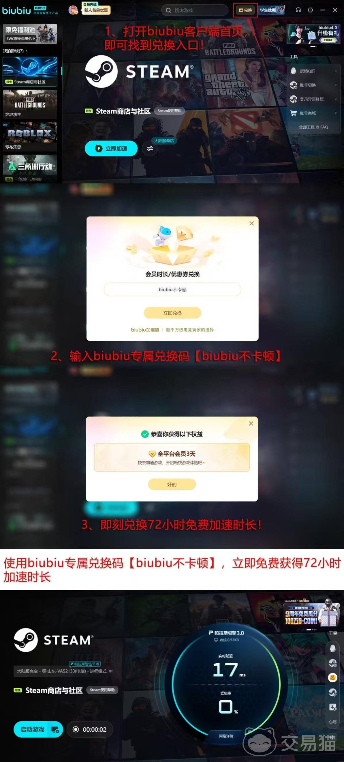 新用户注册后即可领取24小时全场景免门槛加速权益;输入激活码【biubiu不卡顿】可额外获取72小时高品质服务;叠加赠送的96小时综合加速时长,可全面覆盖测试期全部游玩时段,切实解决加载缓慢、角色失步、画面闪退等典型问题,让探索节奏更连贯,协作战斗更精准。