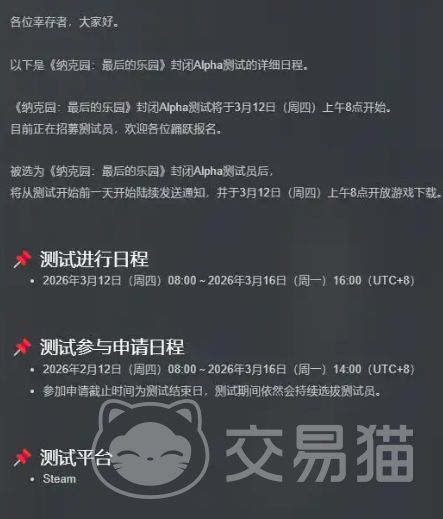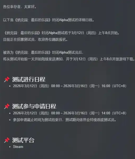 《纳克园:最后的乐园》是一款备受瞩目的幻想题材沉浸式冒险游戏,构建了一个层次丰富、谜团交织的异世界生态。本文将聚焦其全球封闭Alpha测试的关键信息,帮助玩家高效获取参与路径与体验保障方案。本次测试于2026年3月12日正式启动,持续5天,是开发者面向核心用户群体验证系统稳定性、玩法深度与联机机制的重要阶段。