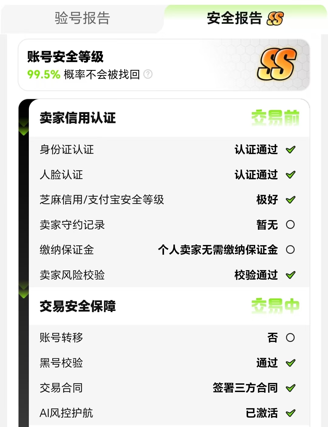 交易猫平台上都是精选真商品,官方验号覆盖的热门游戏上百款。打开每款商品,买家都可以清晰地看到卖家的芝麻信用分。此外,在交易之前,平台通过先进的科技已经将黑号排除在外,有过作弊或找回等不良行为的号,连上架的可能性都没有。