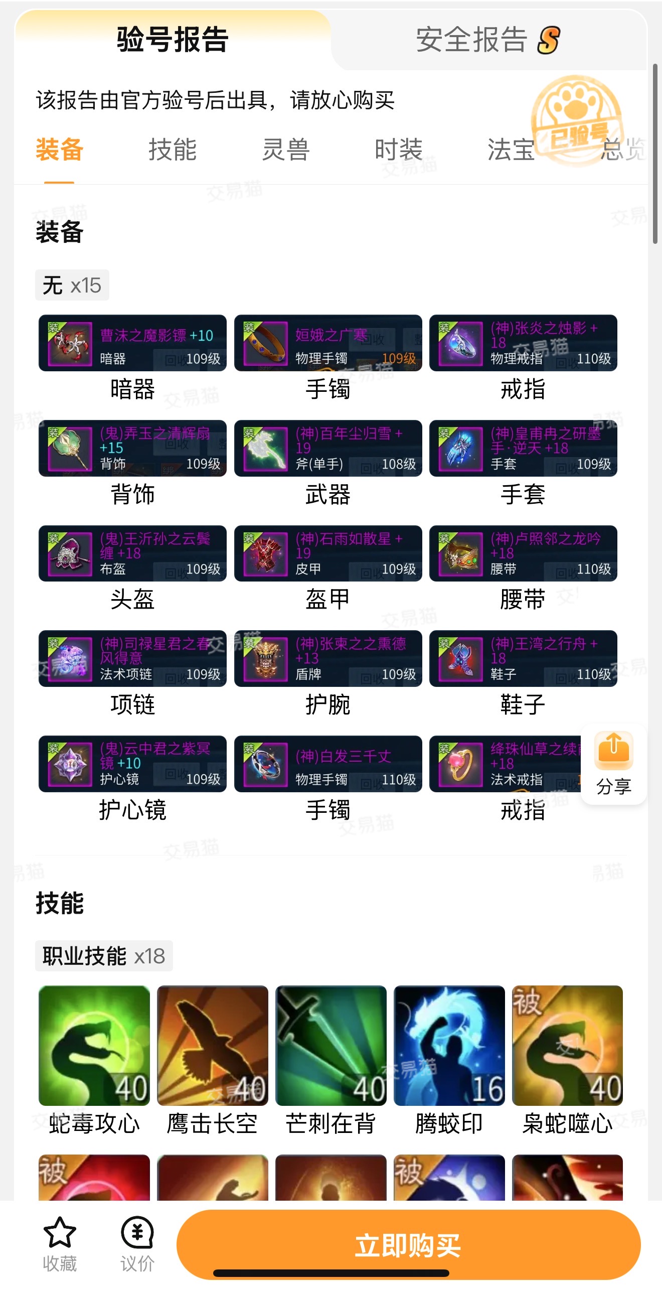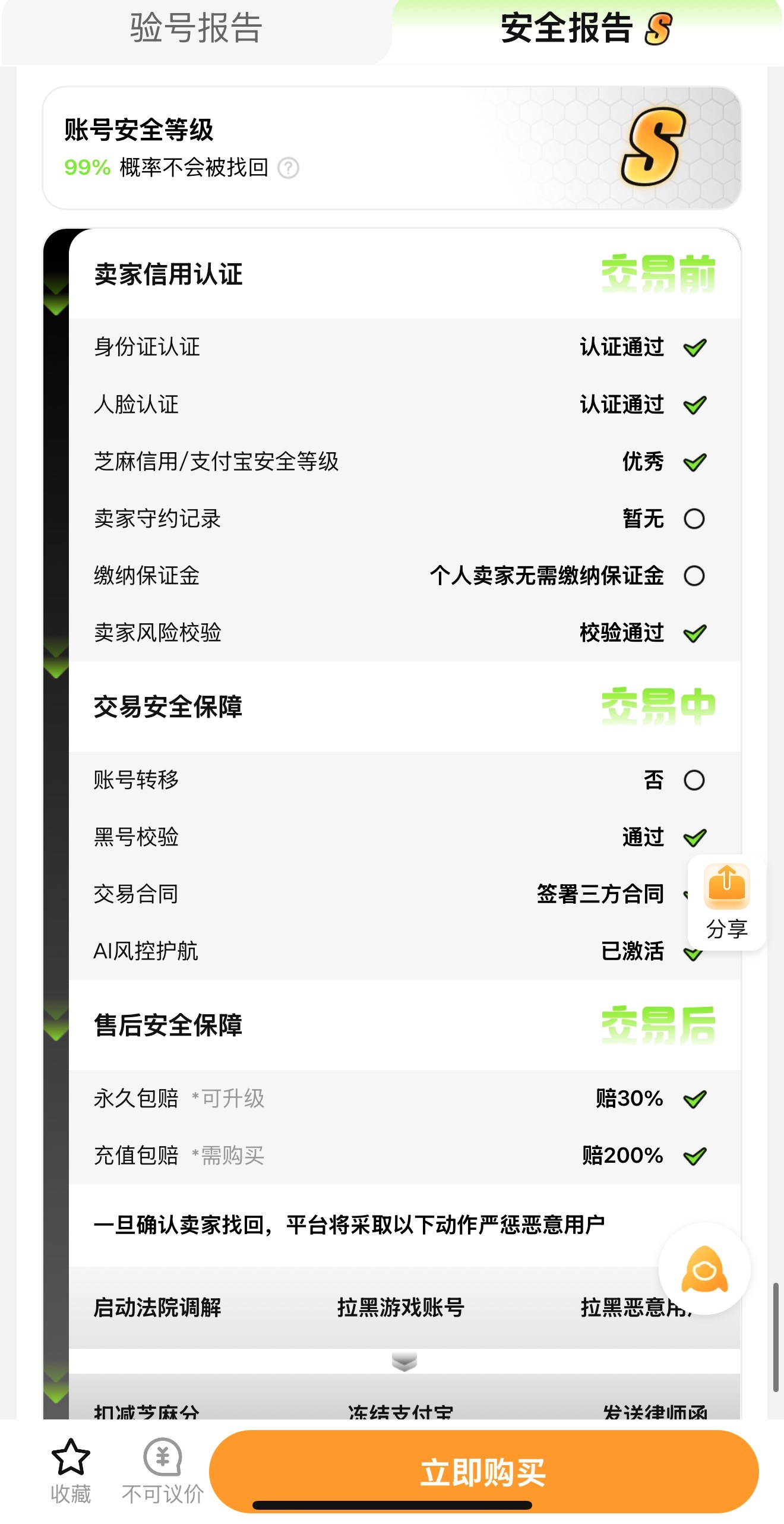 只要有选中心仪的号,就可以直接下单。整个交易都是由平台保障,因为交易猫是属于阿里巴巴灵犀互娱旗下的,有阿里这个大公司背书,还是业内唯一一个享受赠送的永久包赔,不管买了多久,只要账号出现了被找回等非人为的损失,就能够申请理赔,充分保障购买者的权益。