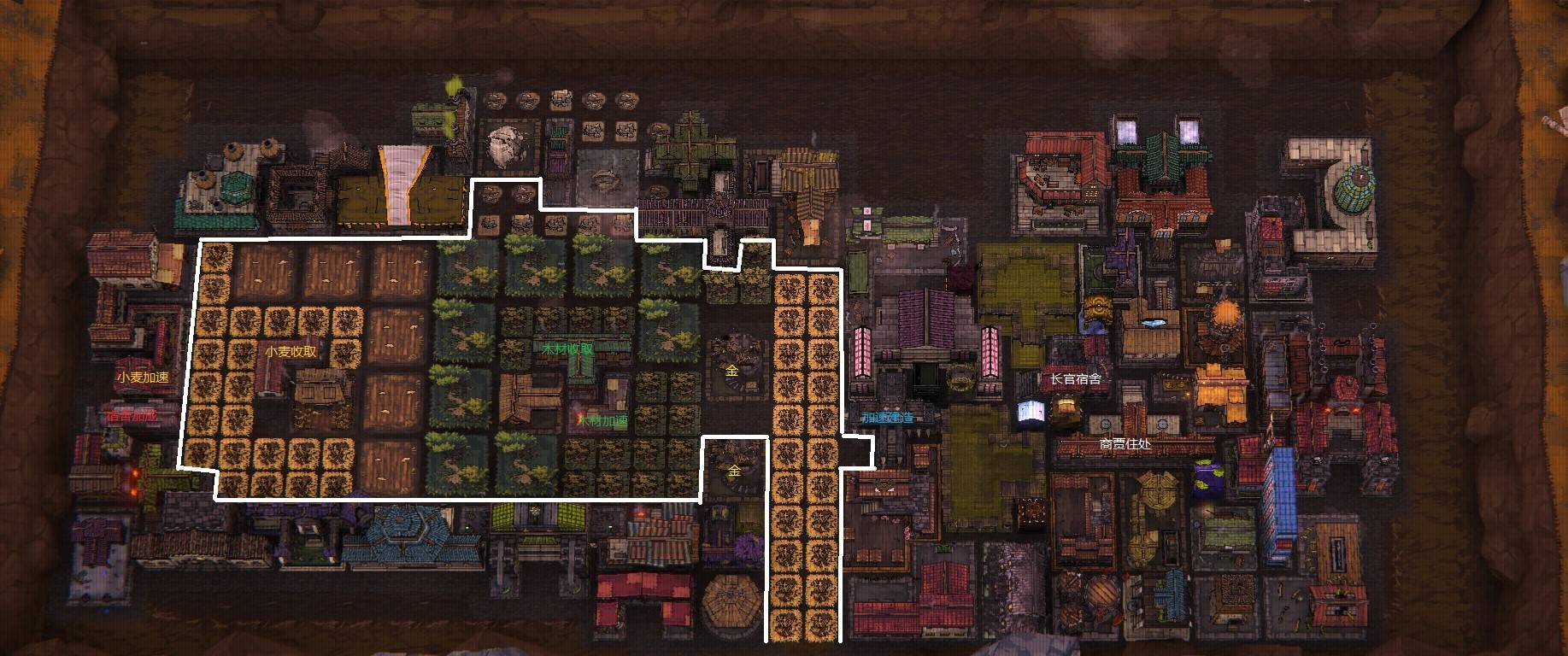 老兵的家需完整覆盖全部人物的家,持续提供经验获取加成;长官的家则应覆盖所有属性类建筑,稳定输出属性成长增益。若仍不确定具体落点,可参考下方示意图:图中白色区域为资源采集活动核心区,其余加成型建筑均已按最优逻辑进行空间排布,兼顾效率与扩展性。