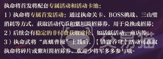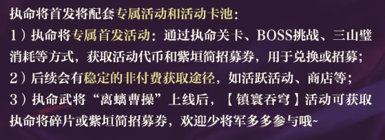 为助力玩家快速组建执命阵容,官方同步推出“枭之歌”主题限时活动及专属召唤卡池。参与活动任务、完成挑战目标即可获取执命资源,用于招募离螭曹操及其他后续执命武将。