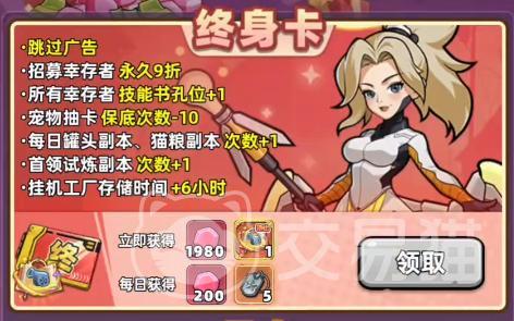 关键战力增益在于:激活后所有幸存者技能书插槽数量+1,直接影响技能体系构建深度与战斗策略上限。宠物抽卡保底次数降低10次,显著缩短高稀有度宠物获取周期。日常资源副本(如罐头、猫粮本)每日挑战次数上限提升1次,强化养成效率。