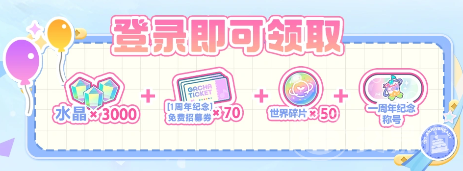 首项福利为“周年登录礼”:玩家在活动期间每日登录即可领取3000水晶、70张限定招募券(仅限本次活动内使用,结束后自动失效)、50个世界碎片及专属“一周年纪念”称号。所有奖励均在主界面右上角弹窗提示,一键即可领取,无需额外操作。
