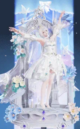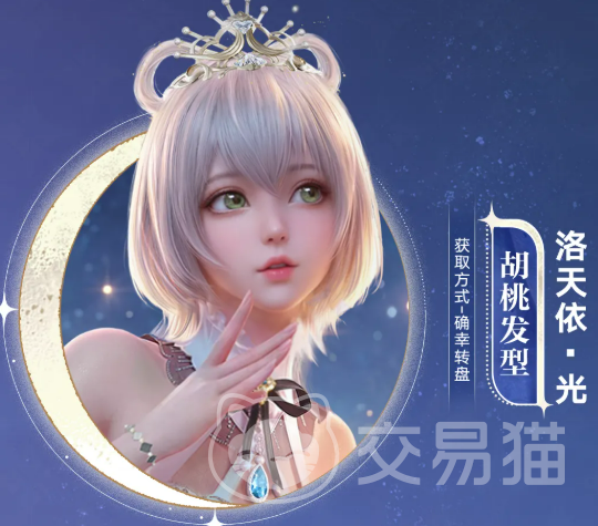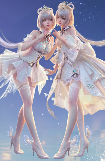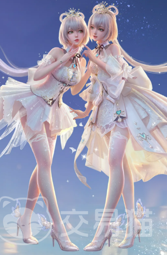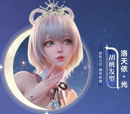 配套发型【洛天依·光】完整保留其标志性∞形蝶翼发尾结构,整体发色为银白渐变,搭配齐刘海与垂落侧发。发饰融合金色镂空部件与蓝色光学钻石,随视角变化呈现差异化折射效果。头纱挂饰【朝雾】采用半透明薄纱材质,密布微粒碎钻与暗纹图案,透光时泛出柔雾光泽,强化整体空灵气质。