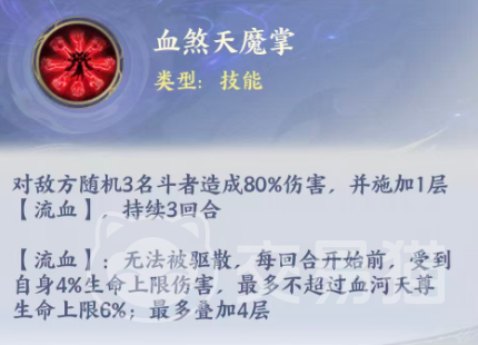 血河天尊定位为持续型输出核心,核心机制围绕“流血”展开。普攻虽为单体伤害,但配合主动技能“血煞天魔掌”,可对敌方随机三名目标造成80%攻击力的群体伤害,并附加1层不可驱散流血效果。该状态持续3回合,每回合开始前,目标将承受自身最大生命值4%的真实伤害(上限不超过血河天尊最大生命值的6%)。流血层数最高可叠加至4层,使群体压制与持续消耗能力兼具稳定性与成长性。