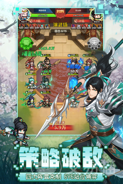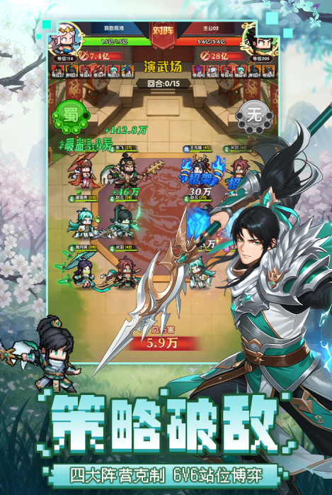 游戏采用6人小队制战斗架构,策略重心集中于阵营克制关系(魏、蜀、吴、群雄)与前后排布阵逻辑,在演武场PVP对抗、主线战役推进等多元场景中形成深度博弈。玩家可招募关羽、诸葛亮等经典三国名将,组建个性化阵容,同时融入原创阵营冲突设定,在还原历史脉络的基础上拓展叙事维度,兼顾情怀表达与内容新鲜感。