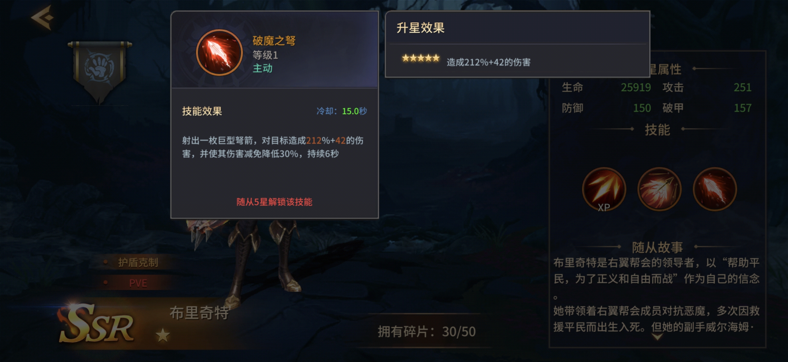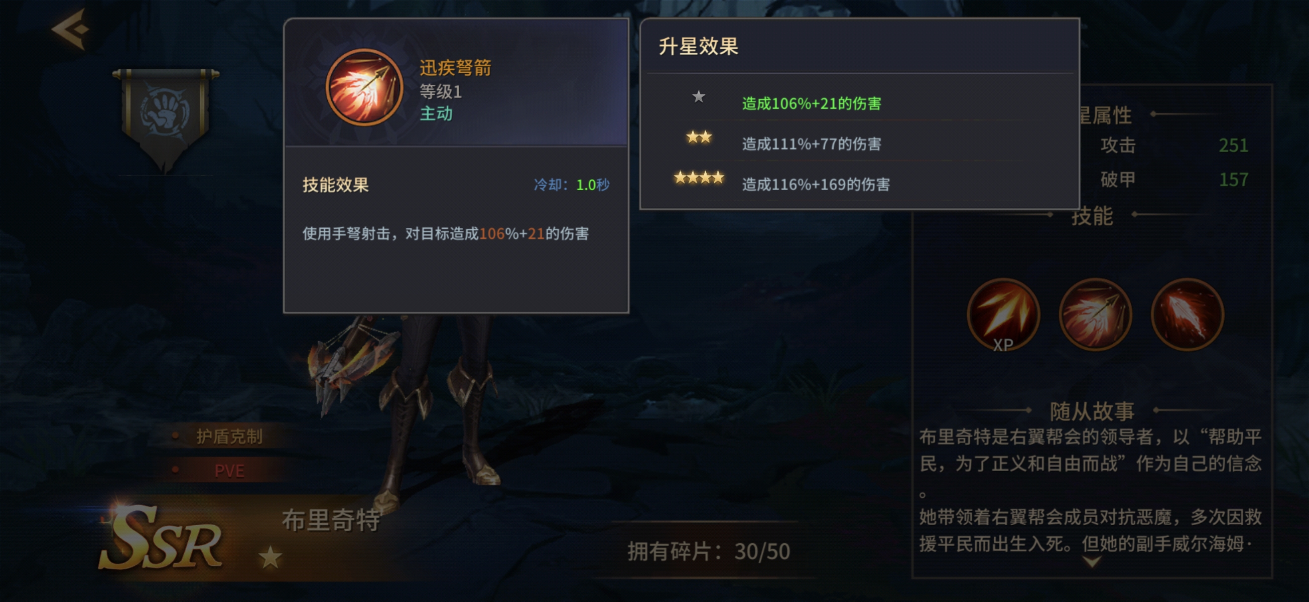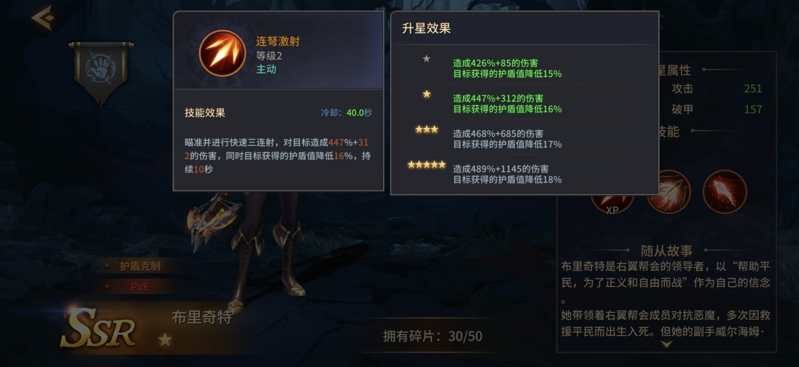 布里奇特的战术定位聚焦于“护盾破除”这一关键环节。其一技能“迅捷弩箭”为基础普攻,通过手弩进行单体打击,随星级提升获得额外伤害加成;二技能“破魔之弩”为手动释放的爆发技,发射巨型弩矢造成高额伤害,并使目标防御减免效果降低30%,该技能需角色达到五星后解锁;三技能“连弩击射”可进行三段快速射击,在造成可观伤害的同时,削减目标当前所受护盾值16%,持续时间固定为10秒。