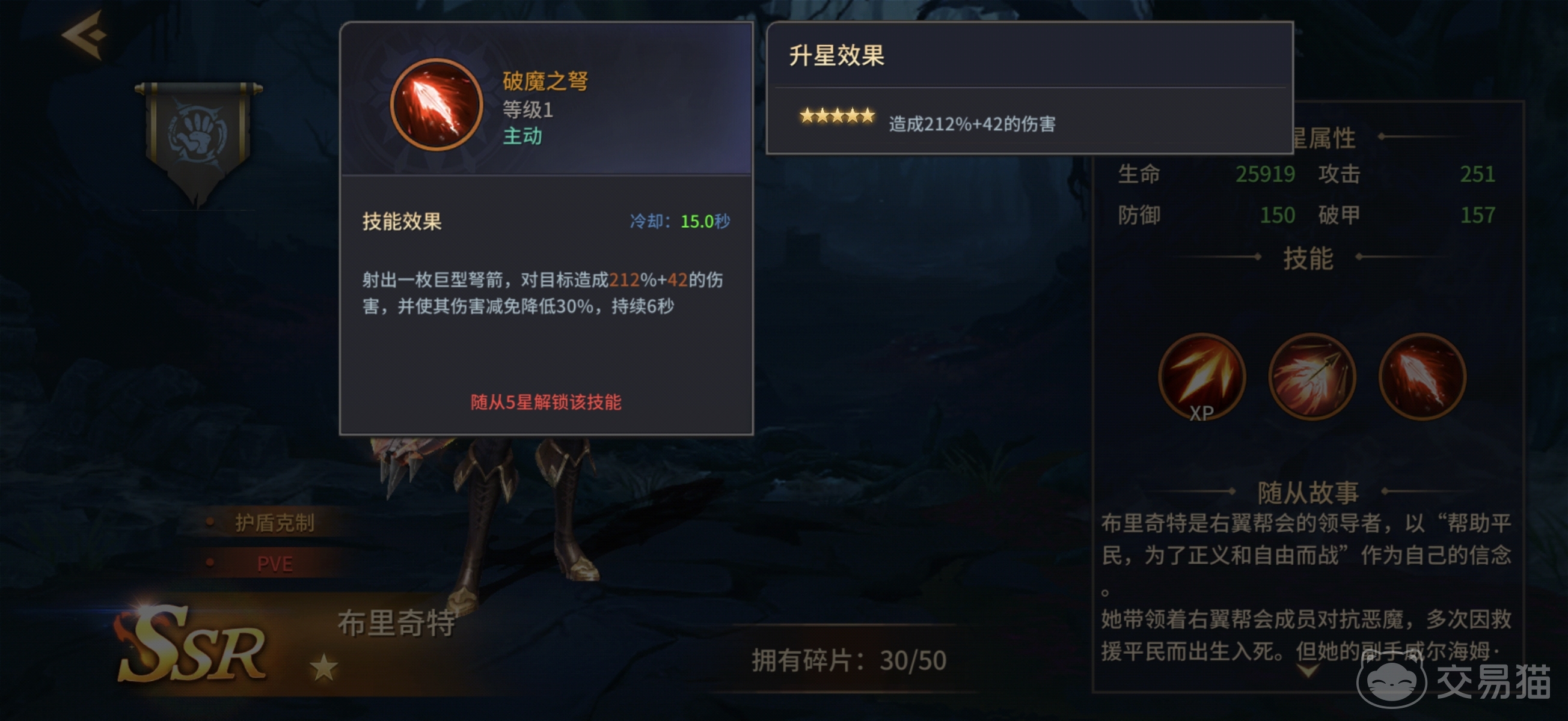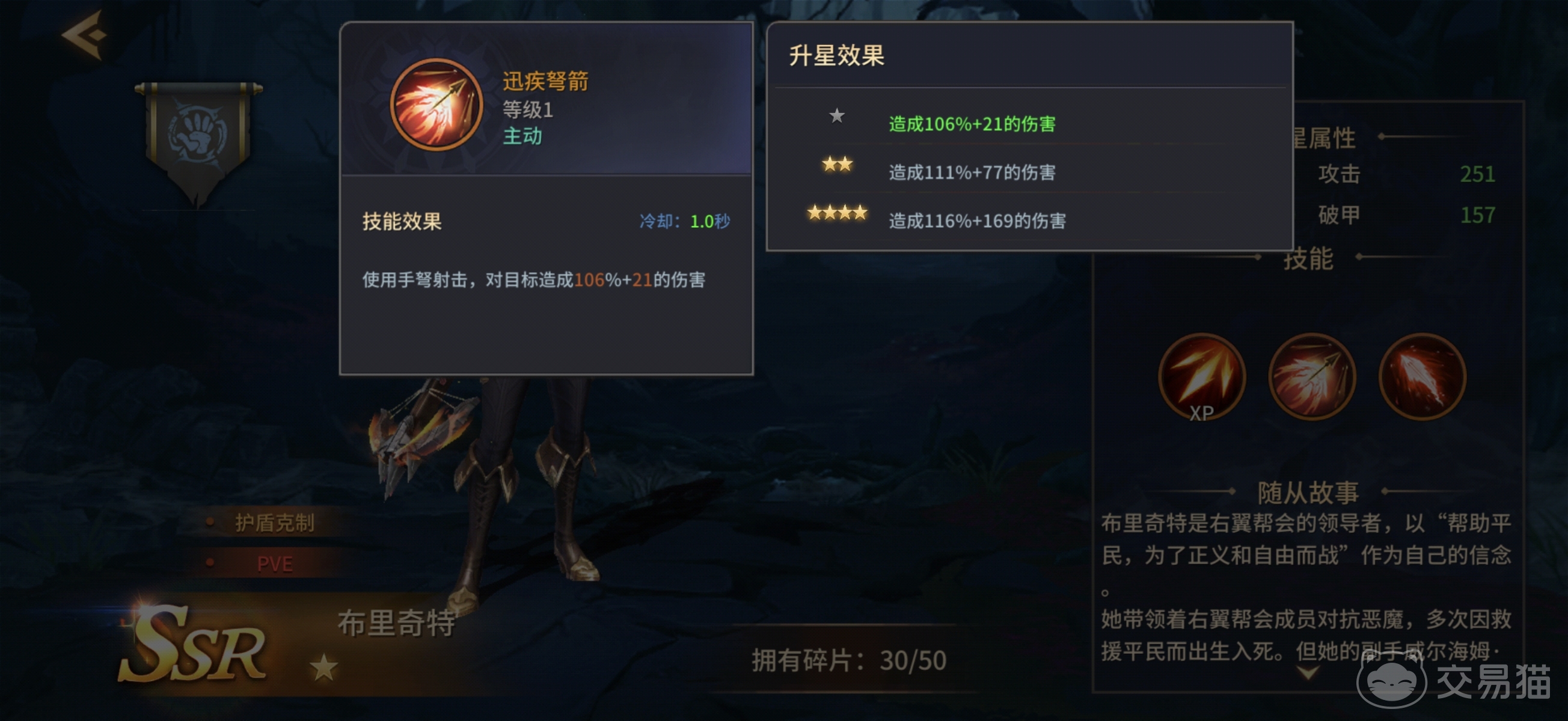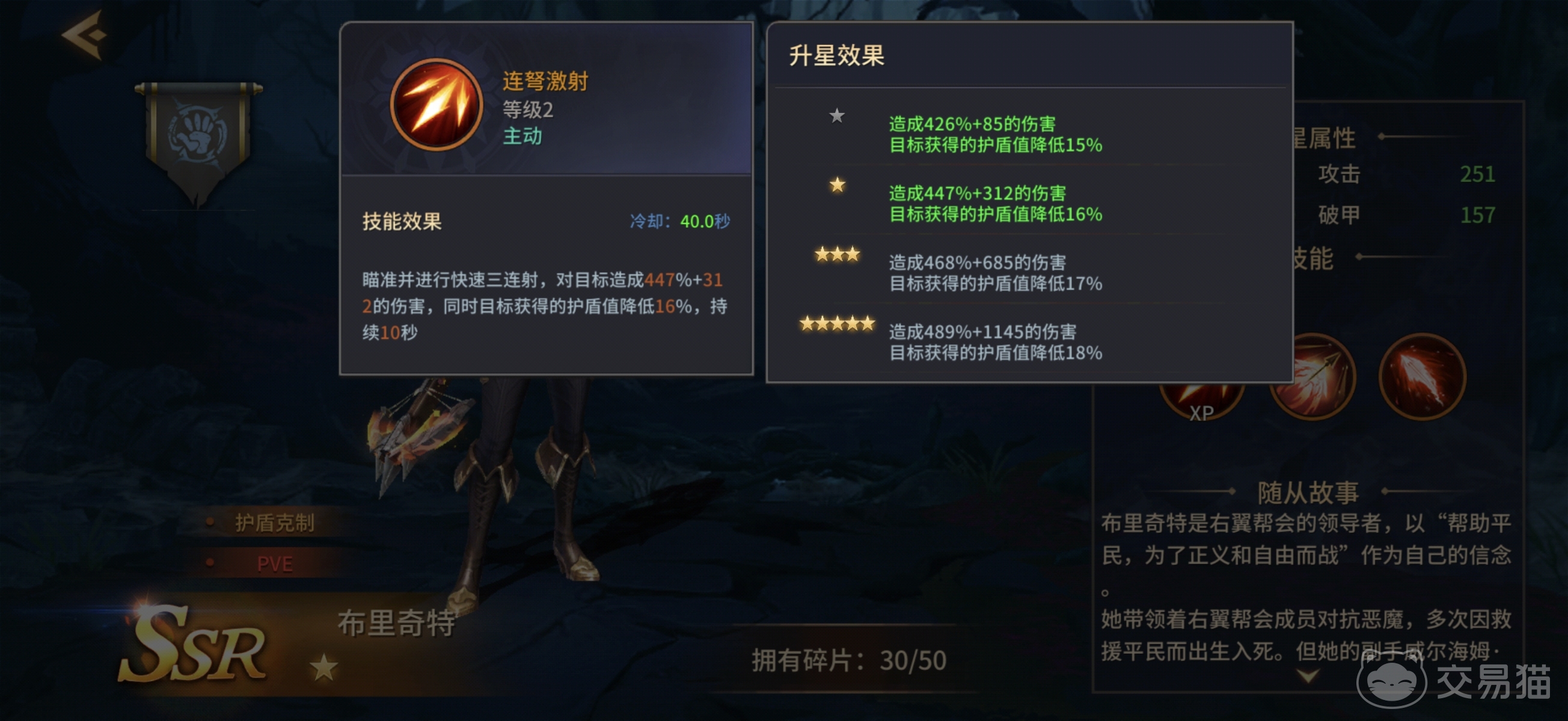 布里奇特的战术定位聚焦于“护盾破除”这一关键环节。其一技能“迅捷弩箭”为基础普攻,通过手弩进行单体打击,随星级提升获得额外伤害加成;二技能“破魔之弩”为手动释放的爆发技,发射巨型弩矢造成高额伤害,并使目标防御减免效果降低30%,该技能需角色达到五星后解锁;三技能“连弩击射”可进行三段快速射击,在造成可观伤害的同时,削减目标当前所受护盾值16%,持续时间固定为10秒。