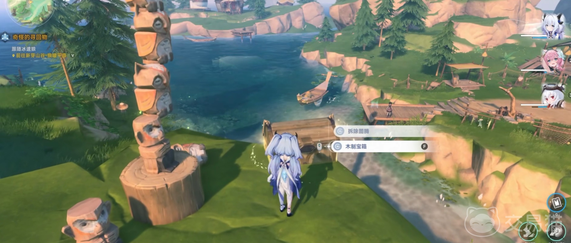 离开村长住宅,向地图左下角边缘跳跃落地,继续向前推进,即可见第四处宝箱。拾取完毕后西行,注意悬挂在空中的吊灯装置,其旁设有光系元素交互点。交互完成后,向地图左侧移动,翻越栅栏后抵达石像区域,石像前方为第三处乌咪调查点,而其左侧即为第五个宝箱所在位置。随后转向东南方向,跨越木桥,在桥体左侧可触发新一轮元素交互。