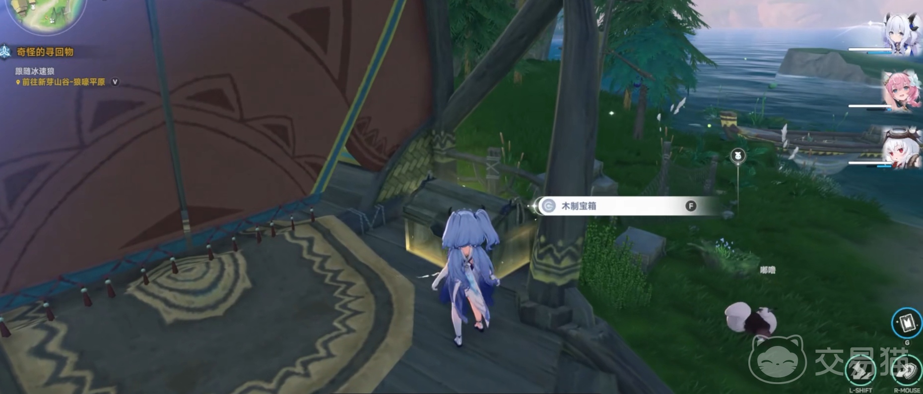 继续前行将遇见一位NPC老奶奶,其周遭布置有第四处乌咪调查任务。完成后沿吊桥路径前进,桥尽头出现一座镂空木质房屋,其底部设有第五处乌咪调查点。调查结束,折返至地图左下区域,寻找名为【缇娜娜】的固定NPC。若未即时相遇,建议调整行进角度重新定位。该NPC身旁存在一只乌咪,其左后方即为光系元素交互点。完成交互后,原路经狩猎场返回,最终向西抵达一处木质高台,顶部即为第六个宝箱(木质)。