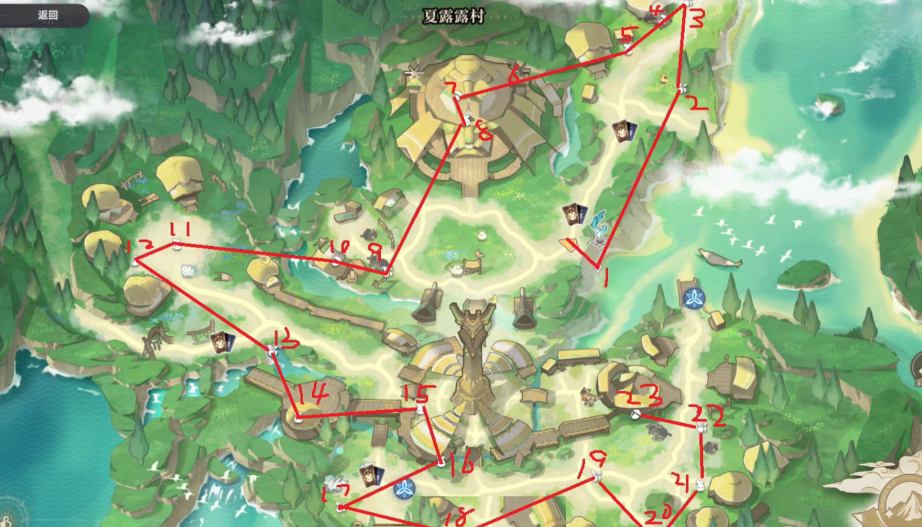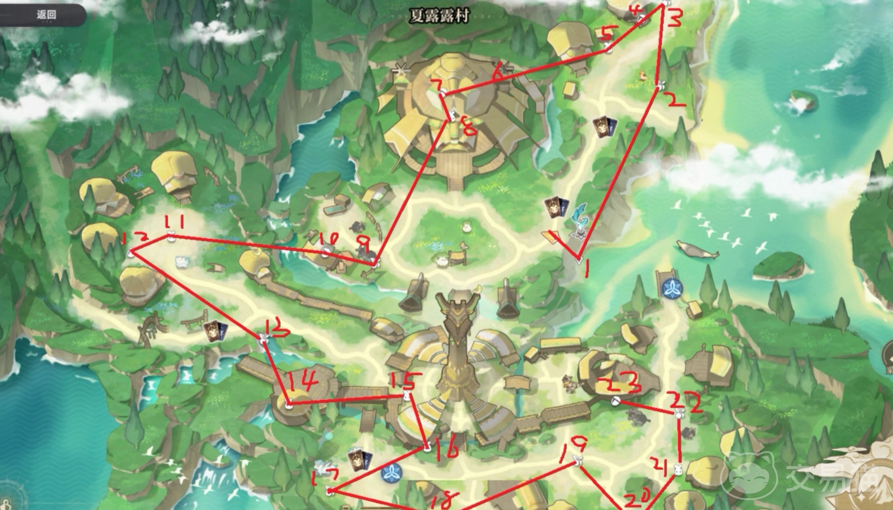 出发前,请确保角色已习得光、木、水、火四类奇波技能,并携带基础图腾装配模块。随后打开【世界地图】,定位【夏露露村】区域。文中所标注的23处坐标点,均已在配套示意图中清晰标出(见下图),其中包含6个宝箱点位(5个木质宝箱+1个银质宝箱)、多组元素交互装置及乌咪相关调查任务节点。