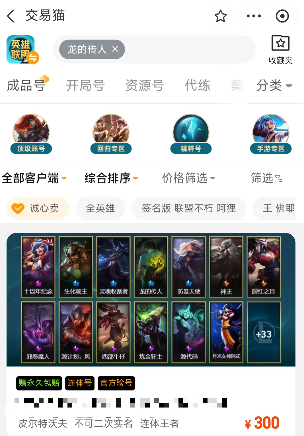 目前龙的传人这个皮肤在交易猫的价格区间是在300-900元左右,其中300元这个区间基本上只有龙的传人皮肤,而附带的皮肤都是一些普通品质的皮肤,所以定价方面就比较低的,如果是定价在900左右的账号,那么该账号里面的皮肤就不仅仅只有一款龙的传人,而且还会携带一些高品质的稀有皮肤,所以玩家们可以根据自己的需求选择购买哦。同时交易猫严选账号资源,官方验号体系覆盖百余款热门游戏,确保每一份验号信息都真实、完整、准确,如果玩家们想要使用的话,安卓用户点击上方按钮直接下载安装,iOS用户可到交易猫直接使用。