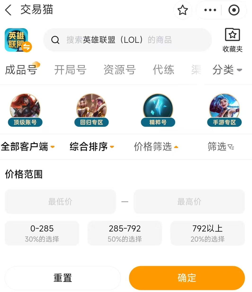 部分玩家的预算是比较有限的,所以只能选择特定区间的价格,那么就可以直接打开交易猫的价格筛选功能,可以直接定价在某个区间,这样玩家们在挑选账号的时候,就不需要担心价格超出预算的问题,就是选择面会少一点,但是也能更加精准地满足玩家需求哦。