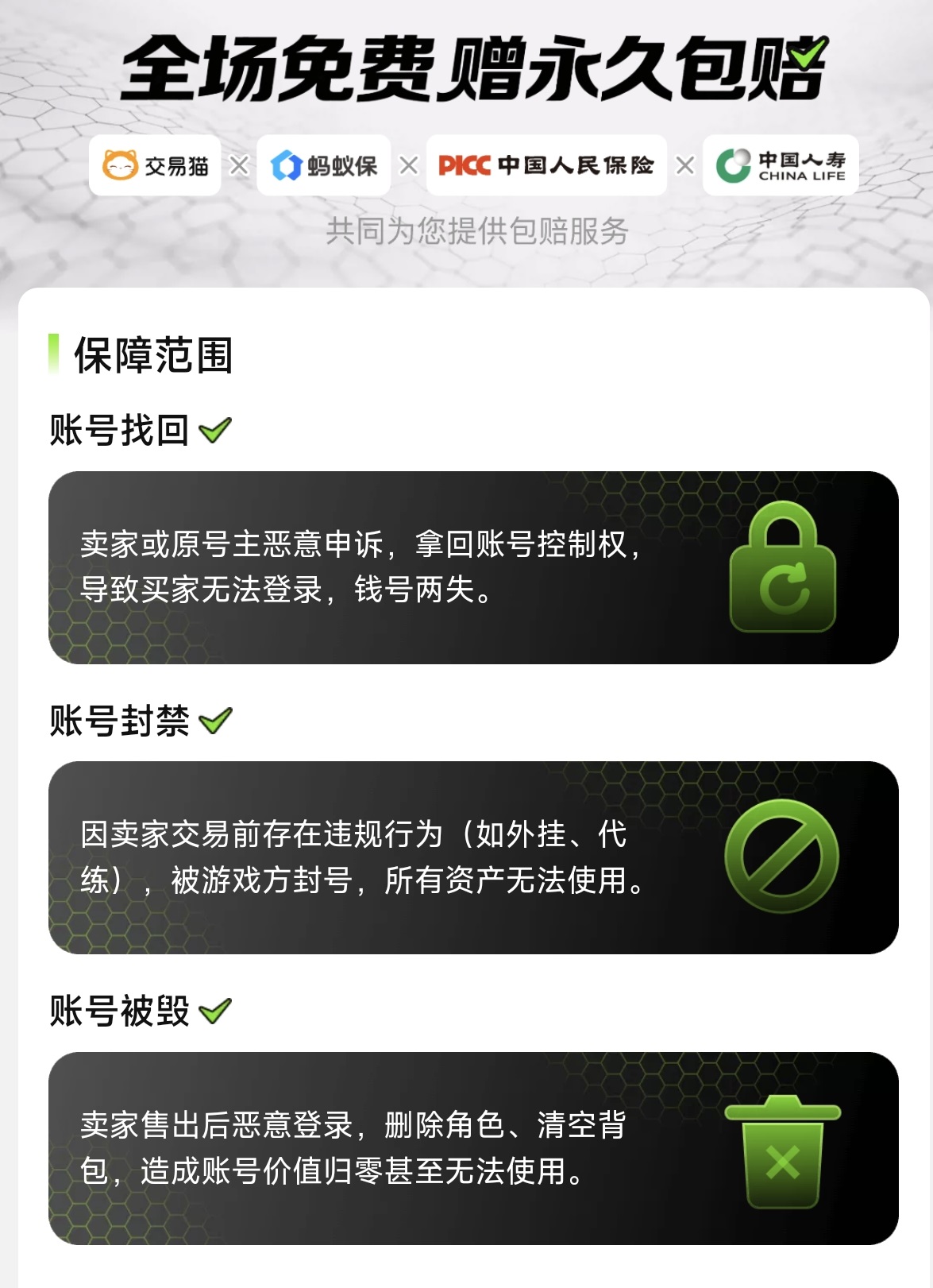 交易猫还是唯一一个做到了全场成品号都覆盖永久包赔的平台,只要是成品号在这里出售,平台都直接赠送永久包赔。只是在比例方面有30%和全额这两类。卖家如果想要快速出售,可以自己升级为全额包赔,买家也可以在购买时进行升级。这样一旦在交易完成后再出现各种情况,都可以联系客服,由平台来进行赔偿。如果是一些比较大额的交易,这项保障措施就显得非常关键。有了官方验号和永久包赔之后,就可放心在这里交易,所以交易猫的成交率非常高。