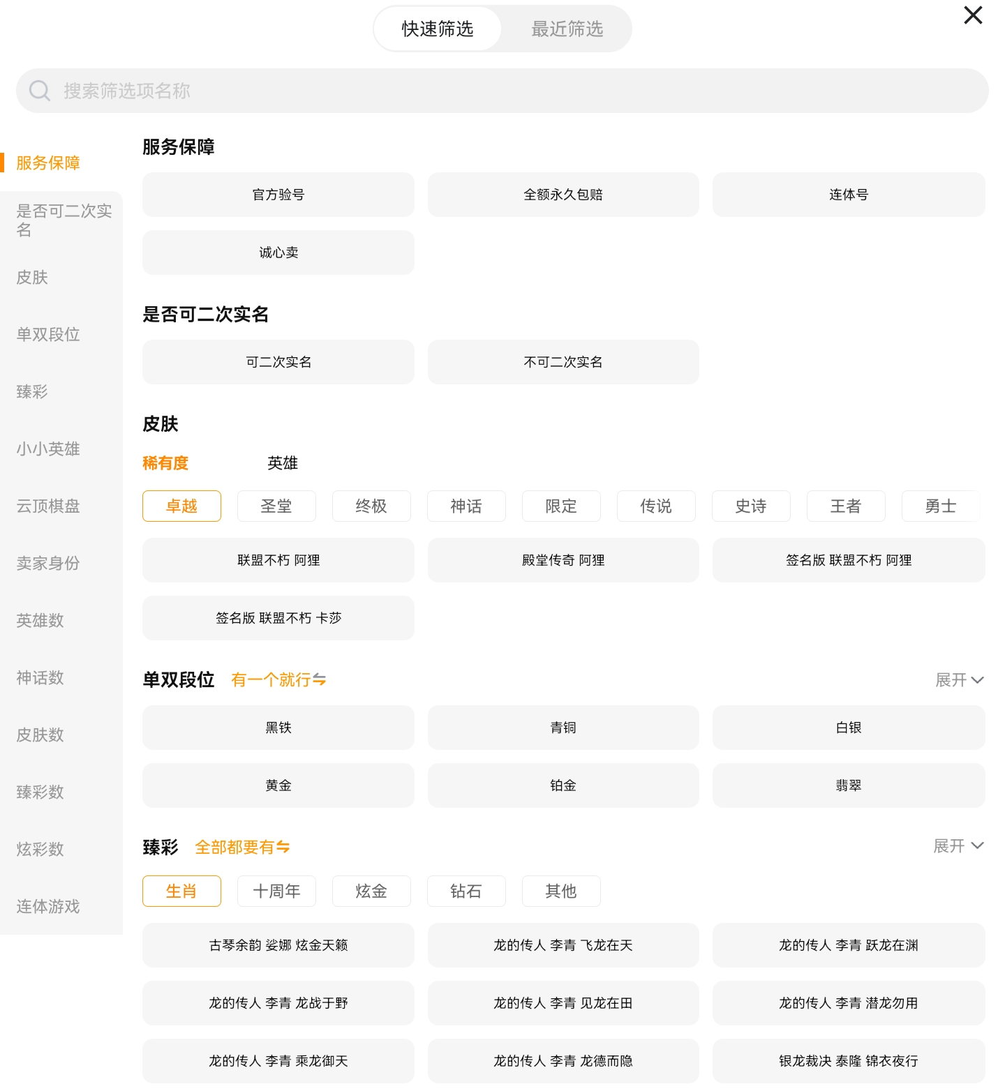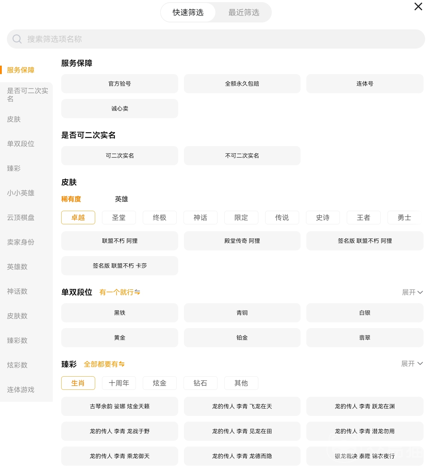 英联联盟是各大游戏账号交易平台上交易最快的内容了,在交易猫上还为大家进行了账号的大致分类,比如说高等级的顶级账号,精品号等,如果在意皮肤数量的话还有v10等级职业的账号,这样能更快的找到自己想要的账号。平台上针对这个游戏有很详尽的筛选选项,玩家对于账号内容有明确目标的话,筛选下很快就出来合适的账号了。