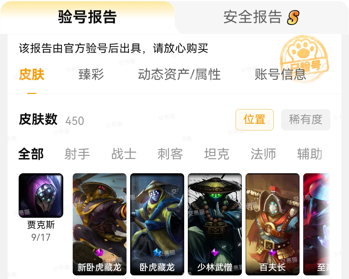 想要再进一步找到合适的账号,可以在众多的账号中关注下有没有【官方验号】这个标识的账号,这样的账号往往是经过了平台的验证,也就是说账号内的详情和卖家提供的一致。想要买号的玩家不也是看中了这些英雄和皮肤,自然要选择最符合自己要求的账号了。选定后就可以进行交易了,在交易猫上交易过程是全程由平台客服来辅助完成,不需要卖家的上线,这样能避免双方达成一致后私下交易的可能性,减低买家可能会遇到的交易风险。