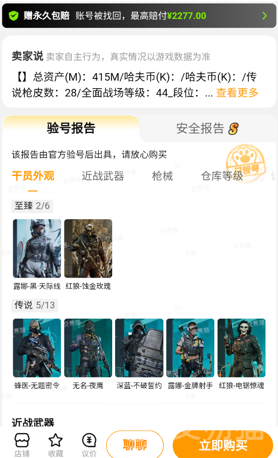 再说交易猫上的特色验号环节,卖家上架的时候可以让平台专员帮忙上号截图,出示具有官方盖章的认证页面。而买家在选购时候勾选官方验号的tag,就能降低货不对版的风险,且在下单以后还能联系验号,直接看账号的武器库、赛季限定皮肤等是否属实。