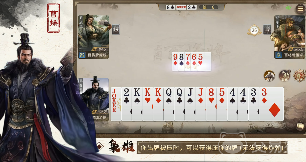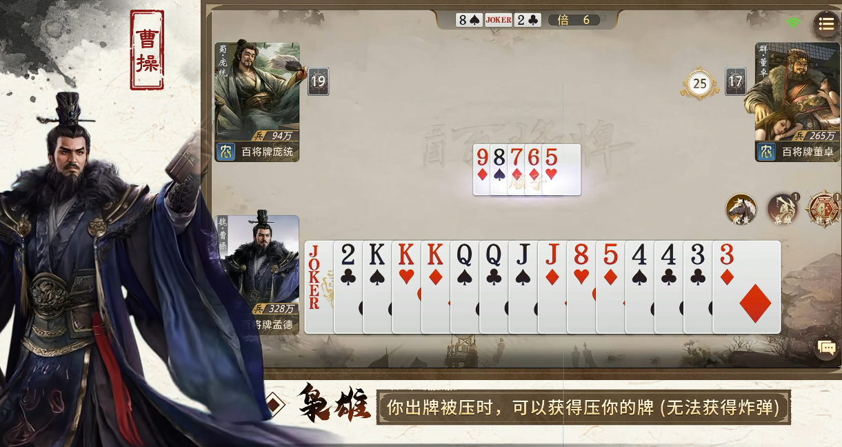 曹操拥有“魏武”与“枭雄”两项主动型技能。其中,“魏武”允许玩家将任意一张点数≥5的手牌减去2点数值,该效果可重复触发,适用于顺子、连对、三带一、飞机等多种非炸弹牌型的构建,显著提升手牌调度效率,缓解卡手困境;而“枭雄”则在自身所出牌型被同类型更高阶牌压制时(炸弹除外),自动回收对方压制所用的全部牌张,实现被动资源反哺,为后续回合积累关键输出组件或干扰素材,形成“越压越强”的滚雪球式成长节奏。