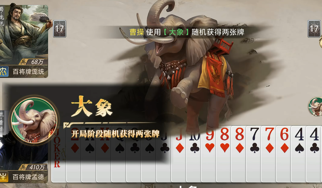 此外,坐骑系统亦可强化曹操的运营上限。例如“大象”坐骑具备随机抽取两张手牌的效果,配合曹操高频减点与持续回收的特性,能显著延长其压制链长度,维持多回合连续出牌压力,从而压缩对手响应空间,主导战局走向。