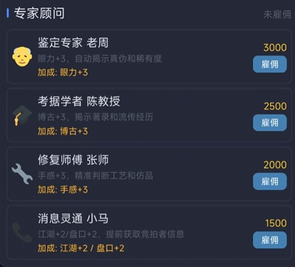 玩家初始身份为一位初入古玩圈的爱好者,并非资深藏家,因此对瓷器釉色、青铜包浆、书画钤印等专业细节缺乏判断力。此时可启用“专家协鉴”功能——通过消耗游戏内资源雇佣不同专长的鉴定师,协助完成高风险拍品的真伪评估与年代断定。