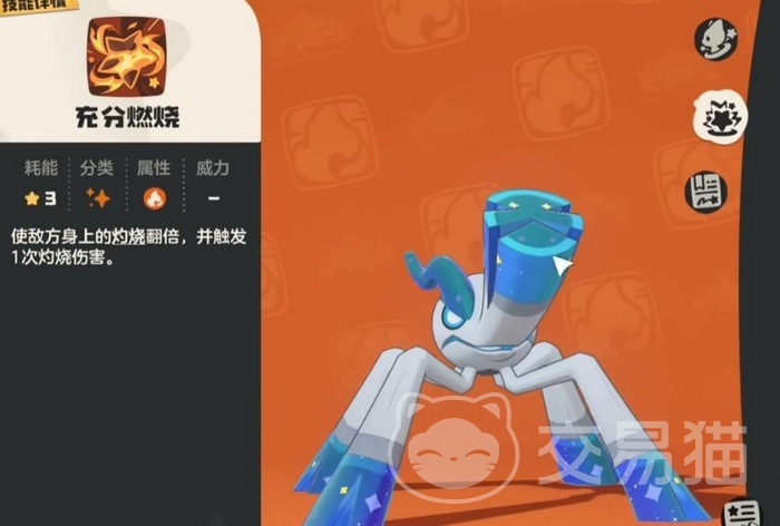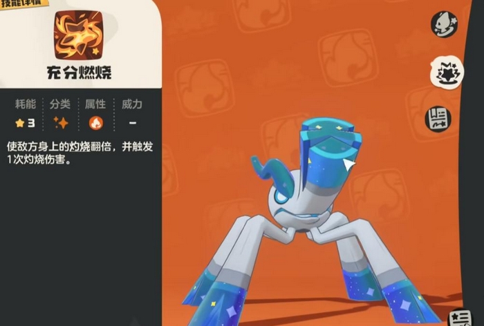 推荐技能配置为:引燃、充分燃烧、火焰护盾、抽枝。其中,“引燃”可一次性施加8层灼烧;“充分燃烧”能将目标当前灼烧层数翻倍,并立即触发一次伤害结算;“火焰护盾”提供70%减伤效果,若成功防御敌方攻击,则额外叠加6层灼烧;“抽枝”为物理攻击技能,在己方处于灼烧状态下使用时,可恢复50%已损生命值并获得5点能量。