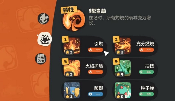 燃薪虫由柴渣虫进化而来,主属性偏向物理输出与高速度。其专属特性名为“煤渣草”,效果为:当燃薪虫处于场上时,所有灼烧状态层数不会随回合自然衰减,反而每回合自动+1层。该机制使其成为非火系首领Boss速通的核心选择。