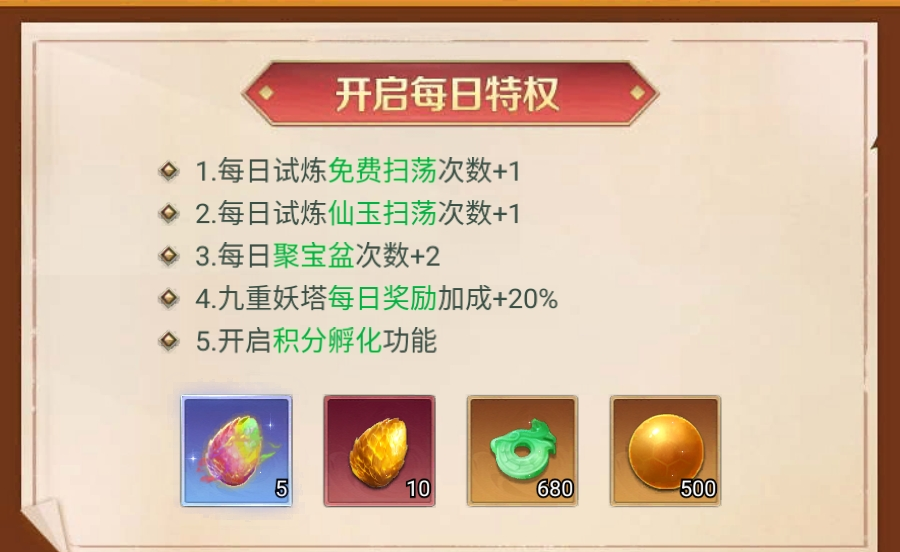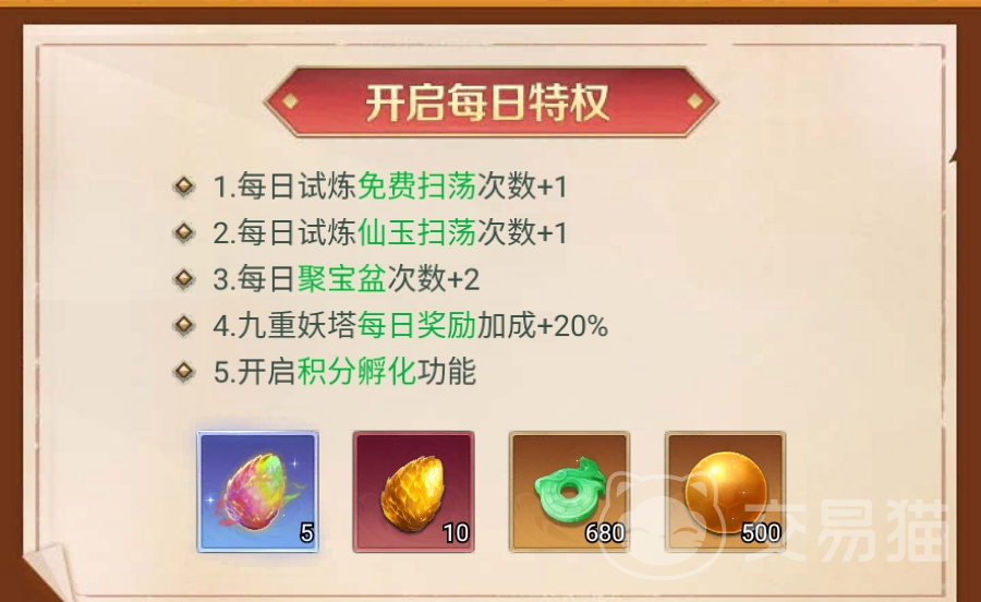 月支出≤30元 | ✓ | × | × | 30元【孵化超值礼包】和两种仙玉特权 | × |