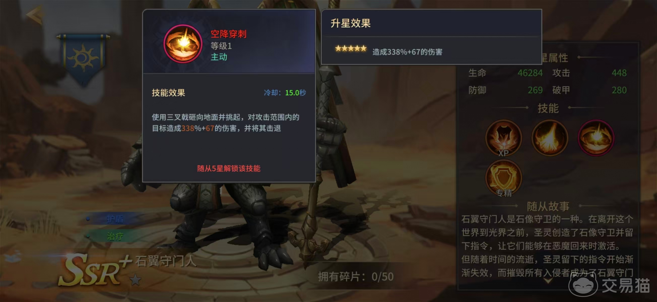 技能机制上,一技能“石刃攻击”除基础输出外,附带20%概率为主角施加岩石护盾,吸收相当于其最大生命值5%的伤害;二技能“空降穿刺”以三叉戟重击地面,对范围内敌人造成范围伤害并触发击退效果;大招“石像附身”为核心战术技能:石翼守门人化为石像融合至主角身上,立即提供相当于主角最大生命值20%的护盾,并提升主角40%随从技能减伤效果,同时每秒恢复主角5%最大生命值。完成升星后,该护盾触发时还将额外赋予3秒无敌状态——此特性在竞技场反杀、BOSS战关键帧规避等场景中具有不可替代的战略价值。