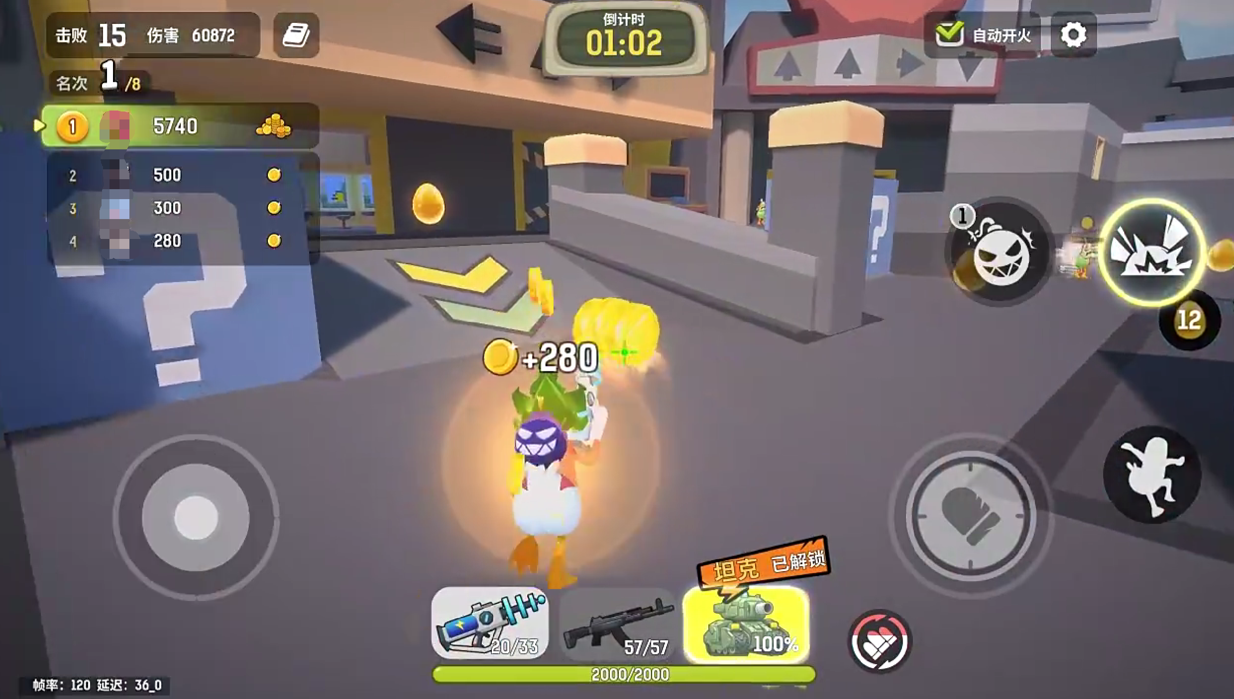 本作采用标准第三人称追尾视角,视野开阔,操作逻辑清晰。移动由左侧虚拟摇杆控制,右侧屏幕区域集成射击、跳跃、交互等核心功能键,并内置智能辅助瞄准系统,无需手动压枪或频繁调节倍镜。所有动作指令均无复杂连招设定,跑位+射击支持单点触发式响应。从账号登录到完成首场击杀,全流程可在数分钟内顺畅达成。配合高饱和度粒子特效与大范围爆炸反馈,每一次射击都带来直观的感官冲击与压力释放体验。