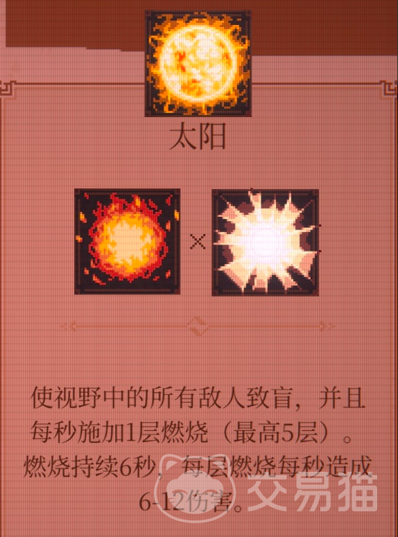 光明球不仅可直接投入战斗,更是多项高阶合成配方的核心材料。例如:光明球与火焰球融合生成“太阳”,生效后使全场敌人陷入致盲状态,并每秒施加1层燃烧效果(上限5层),每层燃烧持续6秒,每秒造成6~12点伤害。
