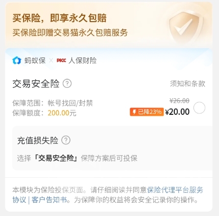 为让玩家去顺利成交各类优质账号,平台还精心带来了安心购保险服务。若想享受高品质服务,入手真实可靠的账号,规避账号被找回、个人信息泄露等风险,只需前往带有安心购标识的商品专区挑选即可。在这里,不仅有平台给出的部分账号永久包赔承诺,更是能获得周到的服务体验。