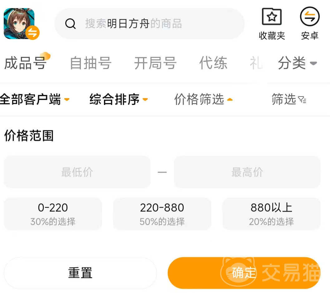 有一部分玩家购买账号是有预算限制的,但是交易猫平台的账号数量太多,这一个一个筛选太麻烦了,那么就可以使用交易猫的价格筛选功能,将价格锁定在特定的区间,这样玩家们挑选的时候就不会超出这个预算,从而快速挑选出满意的账号哦。