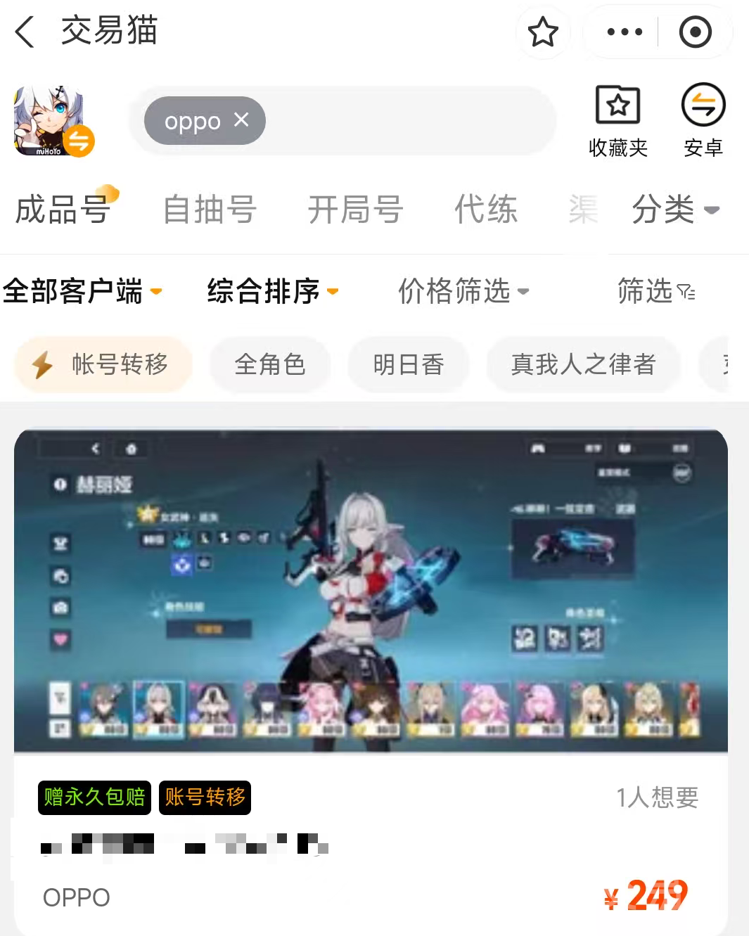 很多玩家在购买账号的时候,都会确定游戏的渠道服,可是找了很多的交易软件,发现oppo渠道服的账号数量实在是太少了,而交易猫这边oppo服数量还是比较多的,而且覆盖的游戏也很广,如果玩家们有需要的话完全是可以到交易猫平台进行购买的,而且平台内的账号信息都是真实存在的,玩家们大可以放心购买哦,并且平台隶属于阿里巴巴灵犀互娱,凭借阿里背书让交易更安心,同时平台独家推出全场永久包赔服务,在业内独具优势。不同设备操作方式不同,安卓端可点击按钮下载安装,iOS用户无需下载,直接登录官网就能使用。