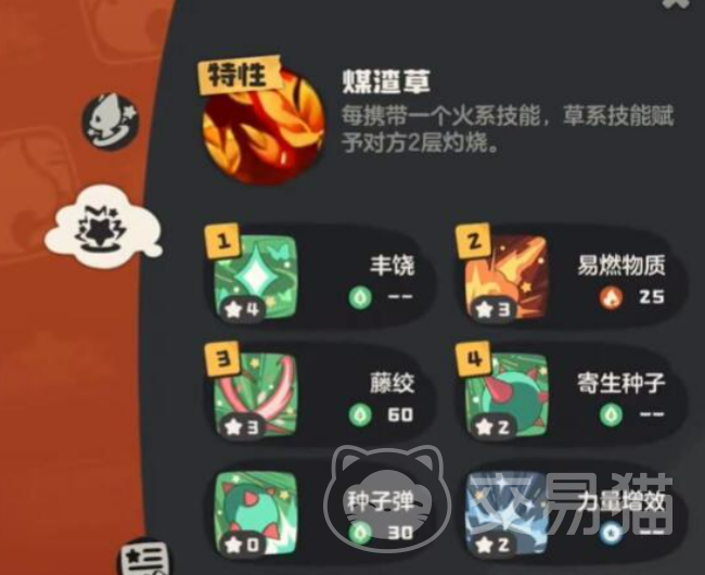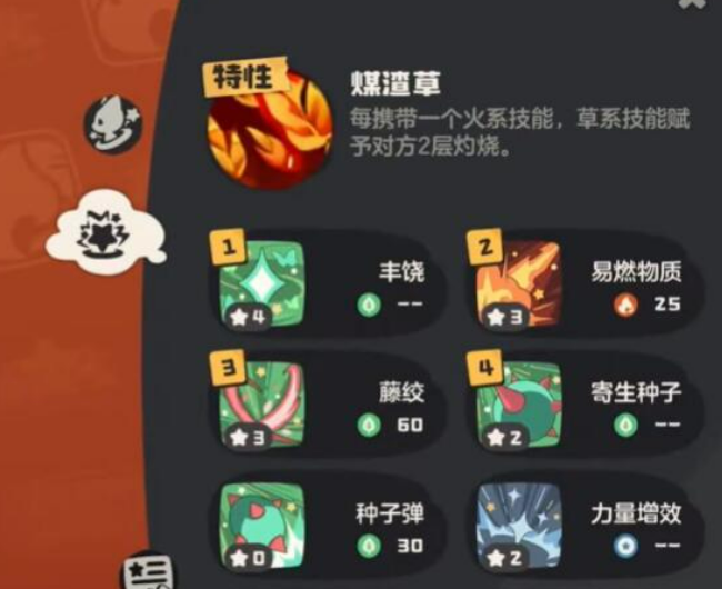 其核心机制“煤渣草”构成整套打法的逻辑支点:当技能栏中至少存在一个火系技能时,所有草系技能命中后均可额外施加2层灼烧效果。该设定直接锁定了最优配招结构——1火+3草,确保每次草系输出均能触发特效,实现灼烧层数的指数级累积。