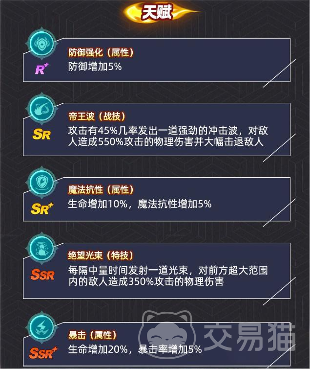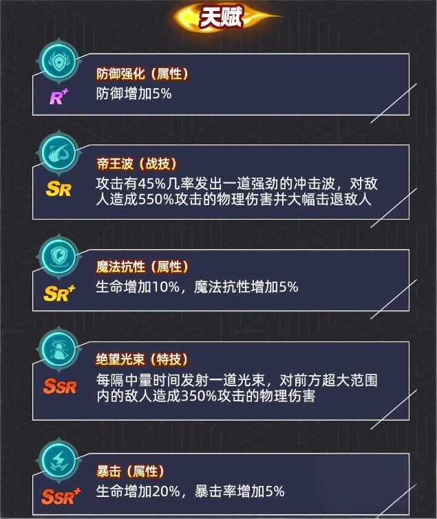 卢卡尔天赋体系涵盖防御强化(提升5%防御力)、绝望光束、帝王波、暴击、魔法抗性及生化屏障六项。其中【帝王波】为远程突进型高伤技能,可对目标造成550%物理伤害并附加击退效果,是其第二核心压制手段。推荐搭配具备硬控技能(如眩晕、冻结、定身)的角色,在帝王波起手瞬间予以限制,避免其打出完整连段与位移衔接。
