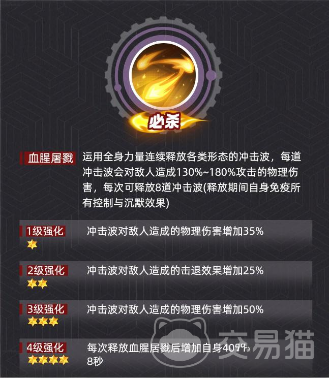 其核心主动技【血腥屠戮】具有显著的阶段化威胁:释放时生成8道物理冲击波,每道造成140%–190%基础物理伤害;全程附带沉默与免疫控制效果。当该技能升至3级后,每次施放将随机触发以下任一效果:窃取目标20点怒气值、触发单体穿透伤害、或对一名敌人造成150%真实伤害。需特别注意——三项强化效果互斥,仅生效其一。应对策略极为明确:必须在技能读条完成前实施有效打断;若未能及时中断,则需依赖队伍整体爆发输出,在技能结束前压低卢卡尔血量,规避后续连锁压制。