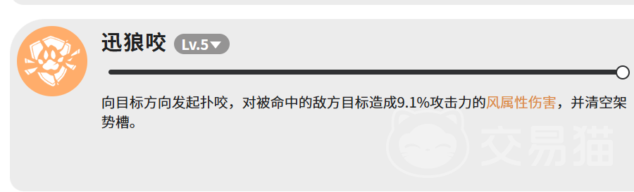 【风牙】为前向扇形攻击技能,对迅狼正前方小范围内的敌人造成一次风属性伤害,倍率为攻击力的79.4%。该技能冷却短、释放稳,主要承担衔接过渡与补刀职能,是构建连招节奏的重要支点。