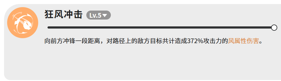 【狂风冲击】为直线突进型技能,迅狼向前方发起高速冲锋,路径上所有敌人均受重击,总伤害达攻击力的372%。该技能判定范围集中、响应迅速,特别适用于敌方纵向密集布阵场景,可实现一击贯穿、多段清场。