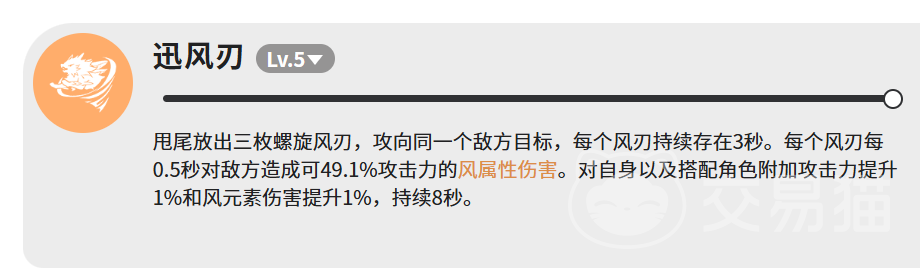 迅狼共拥有四项主动技能,功能定位清晰,协同性强。首推核心输出技【迅风刃】:施放时甩尾释放三枚螺旋风刃,全部锁定同一目标;每枚风刃在命中点持续驻留3秒,期间以0.5秒为间隔共触发6次伤害,单次伤害为攻击力的49.1%;三枚风刃可同时生效,形成高频持续压制。此外,该技能同步为迅狼自身及队伍中所有出战角色提供8秒增益:攻击力+1%、风元素伤害+1%,虽增幅温和,但在多风队或长线作战中具备可观的累计收益。