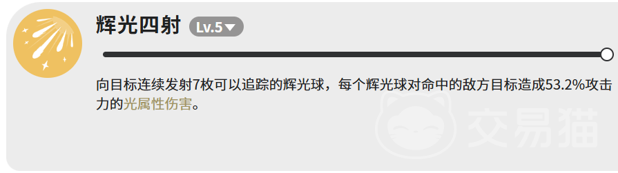 【辉光四射】为其光属性核心输出技。一次性发射7枚自动索敌的辉光球,每枚命中造成53.2%攻击力的光属性伤害。全数命中时总倍率高达372.4%,且追踪机制保障高命中率,是针对高血量单体目标的理想终结手段。