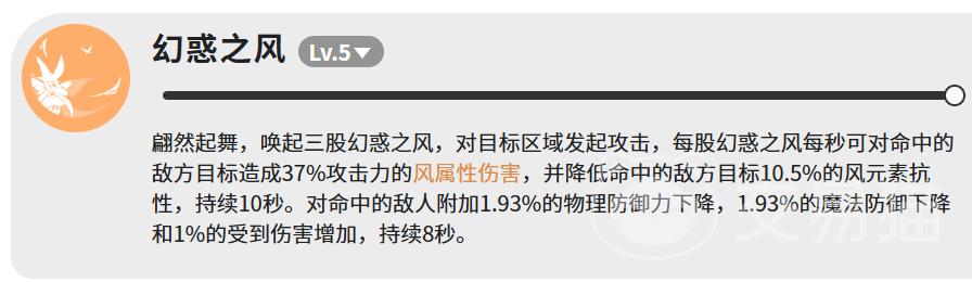 【幻惑之风】是其主力削弱技。释放后在指定区域召唤三道持续旋转的风束,每道风束每秒造成37%攻击力的风属性伤害。三道叠加下,单位时间总伤输出稳定可观。命中目标后,将使其风元素抗性降低10.5%,持续10秒;同时附加物理防御与魔法防御各-1.93%、所受伤害+1%的复合减益,持续8秒。多层减防与增伤协同作用,为后续风系输出构建高效环境。