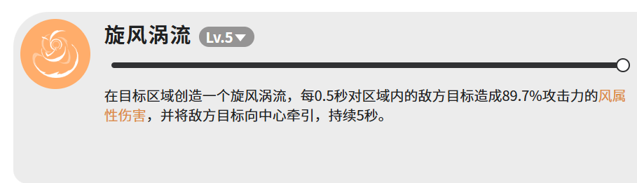 【旋风涡流】为范围控制型技能。在目标点生成持续5秒的牵引型风眼,每0.5秒对范围内敌人造成一次89.7%攻击力的风属性伤害,并强制将其向中心聚拢。该机制兼具持续压制与群体聚怪功能,大幅提高AOE技能覆盖率,尤其适用于应对分散站位的敌方编队。