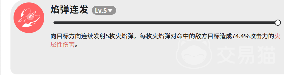 “焰弹连发”为指向性速射技能,向指定方向连续发射5枚火焰弹,每枚命中造成74.4%攻击力的火属性伤害,五连全中总倍率为372%。该技能攻速快、弹道直、覆盖率高,适用于群体压制与节奏衔接。