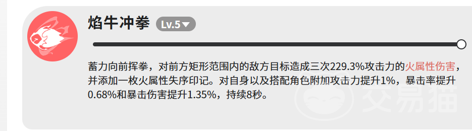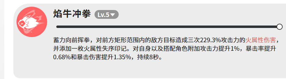 其核心输出技“焰牛冲拳”在满级(Lv.5)状态下具备三段判定矩形范围攻击,每段造成229.3%攻击力的火属性伤害,并额外施加一枚火属性失序印记。该技能同步激活团队增益:提升自身及编队内所有角色1%攻击力、0.68%暴击率、1.35%暴击伤害,持续8秒。虽单层增幅数值温和,但在多角色协同作战场景下可形成稳定叠加效应。