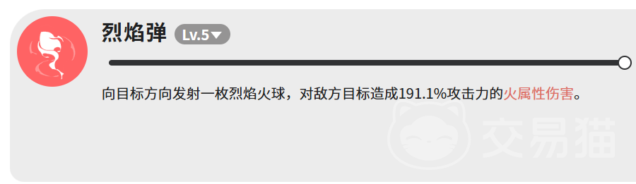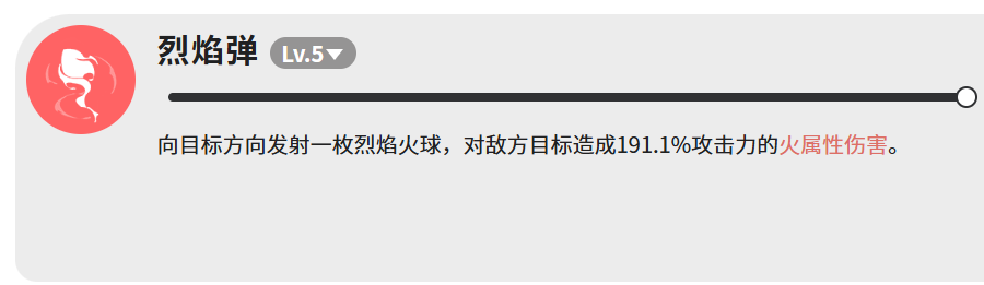 “烈焰弹”为单体高能投射技,释放一枚火球对目标造成191.1%攻击力的火属性伤害。其高倍率与精准锁定特性,使其成为应对高血量Boss或关键单位的首选终结手段。