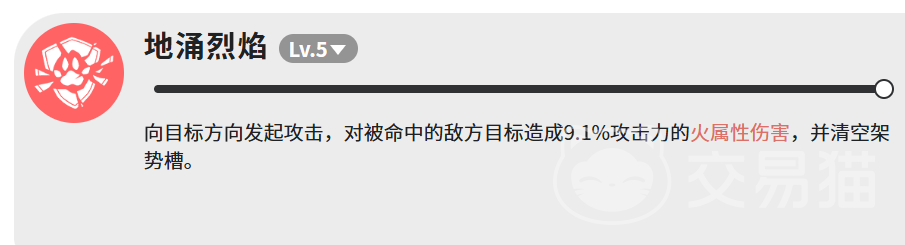 “地涌烈焰”表面伤害仅9.1%攻击力,实则承担核心战术职能:强制清空敌方架势槽,触发破防硬直状态。此效果不依赖伤害数值,而是构建连招链路的关键枢纽——破防后接续任意高倍率技能,均可获得显著伤害加成,是体系化输出不可或缺的前置环节。