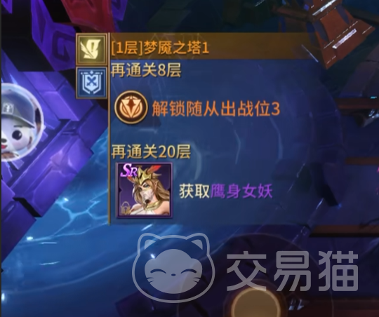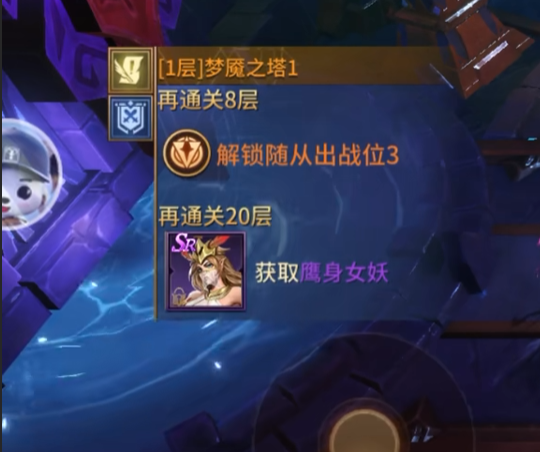 随着层数提升,梦魇之塔的奖励梯度同步增强。规则明确:玩家累计通关至第9层(含首层),系统将自动解锁随从出战位3;自此,队伍作战单元由原先最多2人扩展为3人协同,大幅拓展技能联动空间与战术容错率。当玩家持续挑战至第20层时,将获得SR级伙伴鹰身女妖作为通关里程碑奖励,该角色具备独特战场定位与成长潜力,是中后期阵容构建的重要支点。