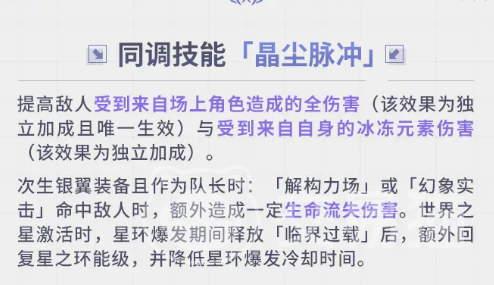 完成超限后解锁「苍雷星梭·初号协议」,其同调技能「晶尘脉冲」提供独立生效的全伤害易伤效果(同类加成仅一项生效)。次生银翼装备并担任队长时,「解构力场」或「幻象实击」命中敌人将追加生命流失伤害。在世界之星激活前提下,星环爆发中释放「临界过载」后,还可额外回复星之环能级,并缩短星环爆发冷却时间。